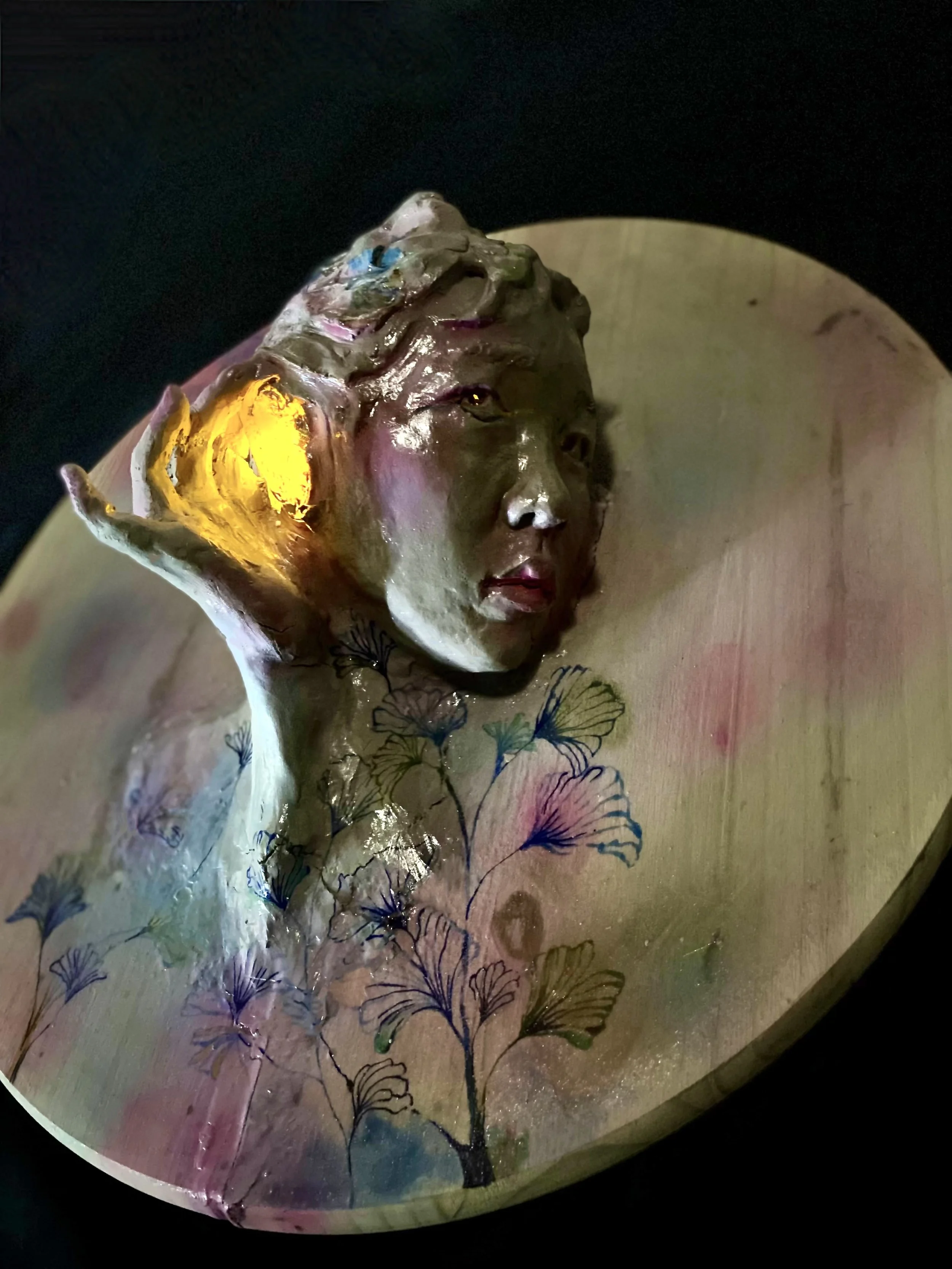 I crafted a self-portrait sculpture relief that captures the intimate moment of “listening.” In this piece, my posture and expression reflect deep attentiveness, conveying that to listen is to truly care. The glowing ear symbolizes warmth and a heartfelt connection, extending my presence to the storyteller—whether they are a friend, a stranger, or even the gentle rustling of ginkgo leaves in the autumn breeze. Each element is designed to evoke the beauty of connection and the profound impact of being fully present in the act of listening.