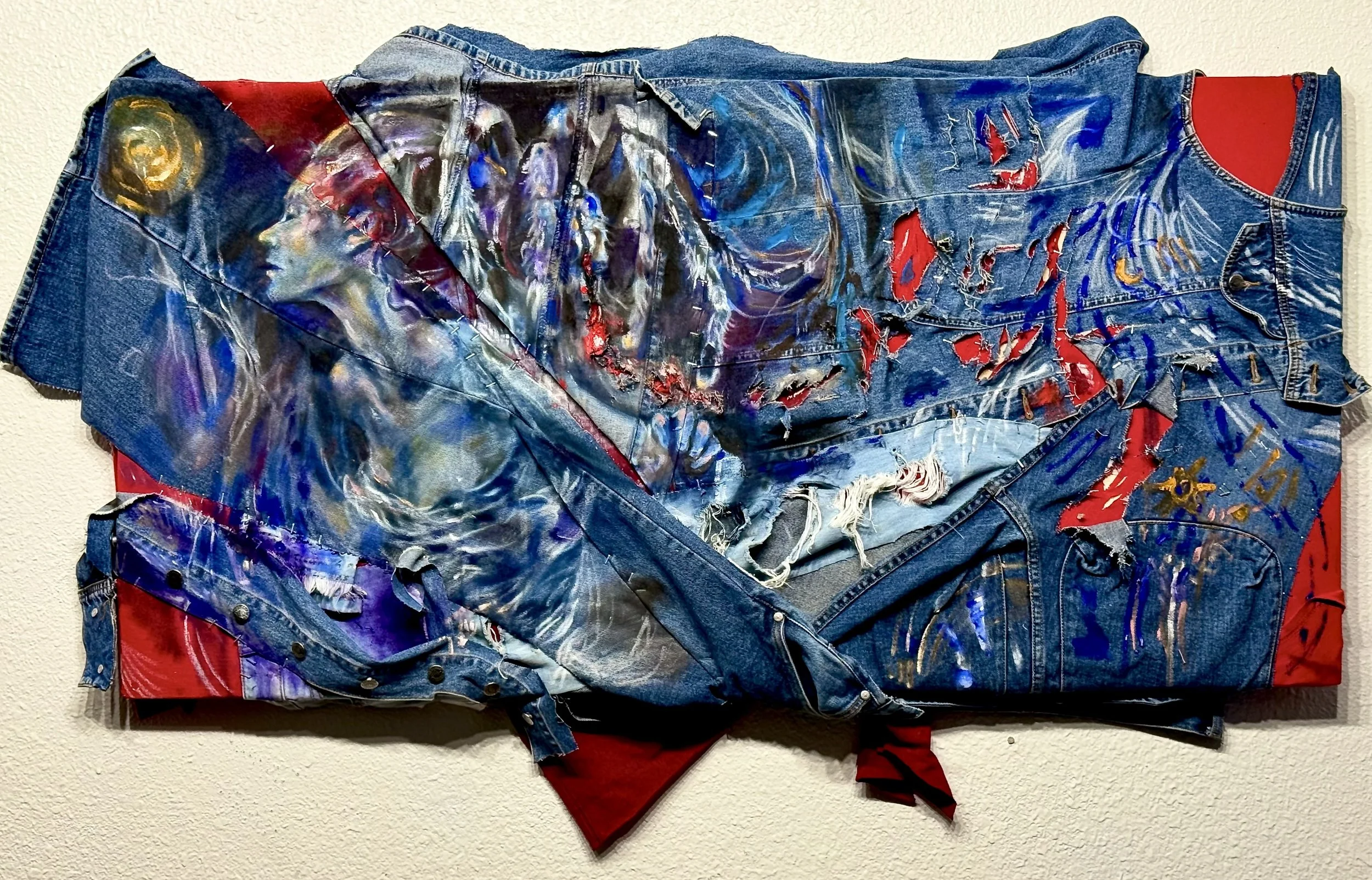 Medium: Mixed media (oil on canvas made from denim and cotton fabric stretched on wood panel)