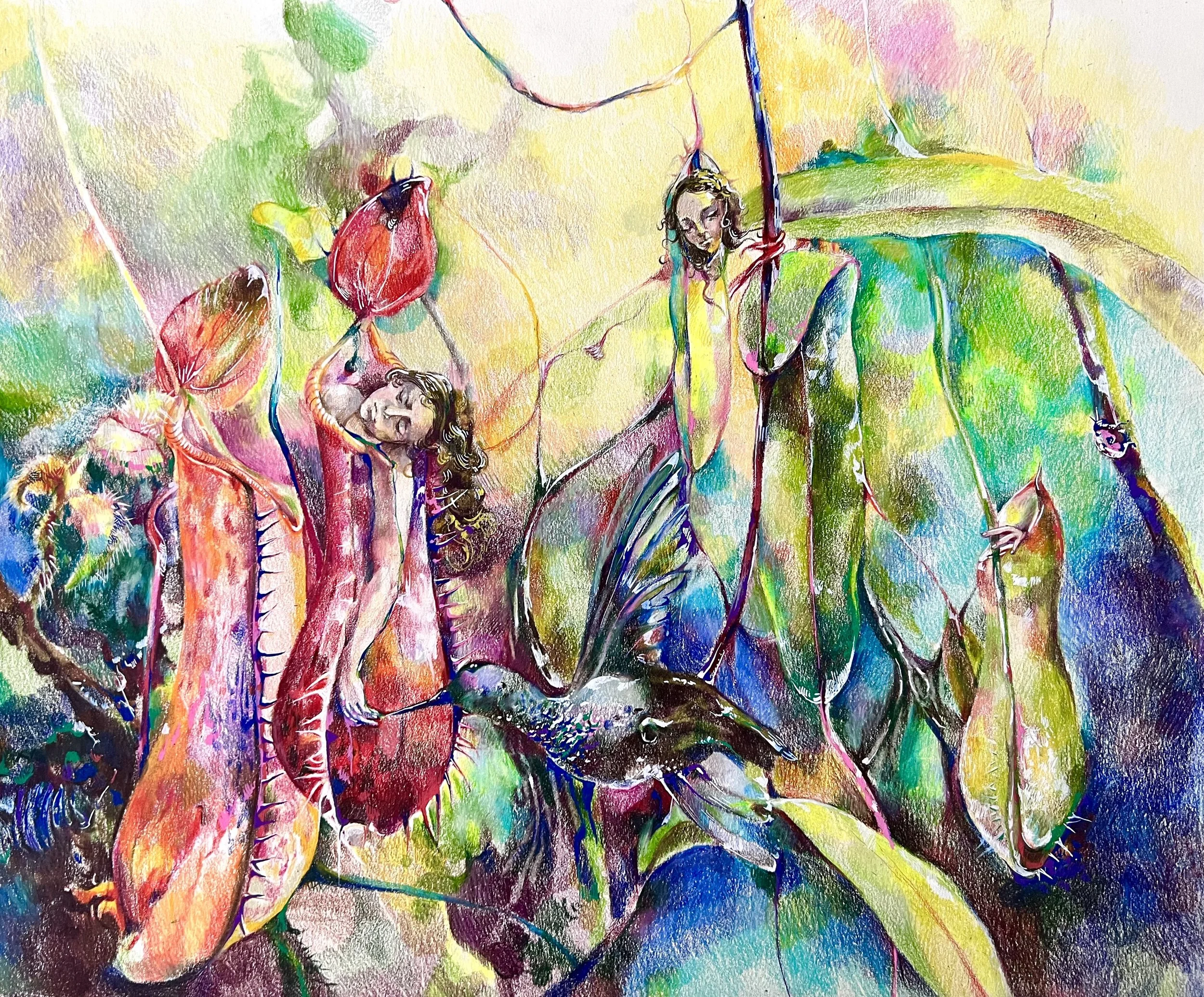 Depicting a world with its food chain reversed, carnivorous plants feed off of humans instead of insects, and hummingbirds drink the moisture of succulent flesh. As time moves forward, nature does what it has to do to survive while maintaining its enchantment (fantastical colors contrasting the destructive process), but humans, if still treating nature as incessantly forgiving, do not possess infinite beauty and will be overtaken.
