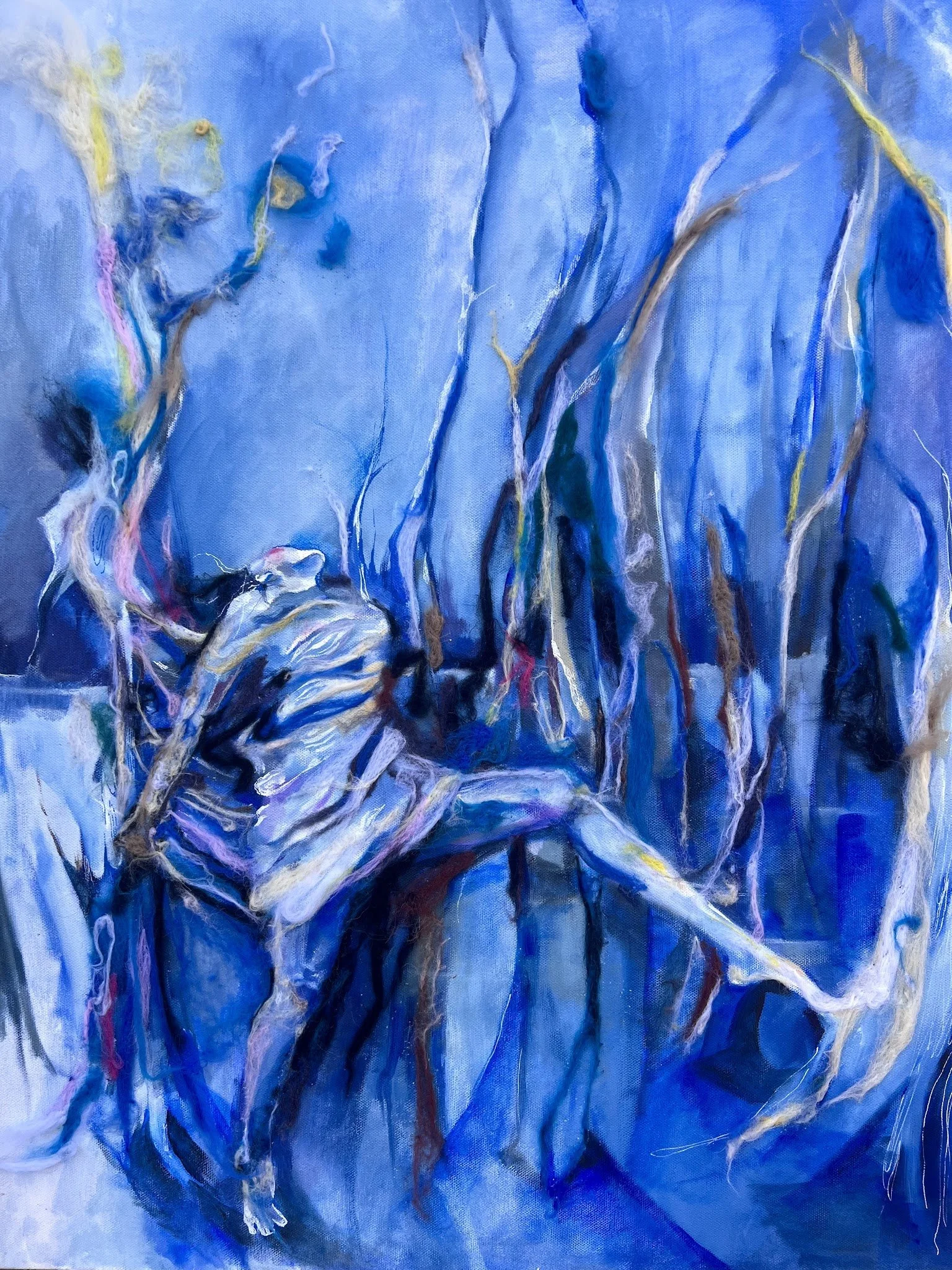 As she longs for the forgiveness of time, she desperately holds on to her present (the tree she is a part of), while being unwillingly unraveled and connected to another tree. In this piece, I use blue and felted wool to convey a sense of calm and comfort the past bring us while the lack of “naturalistic” hues comments on the denial to accept the pending future and its potential statics and chaos.